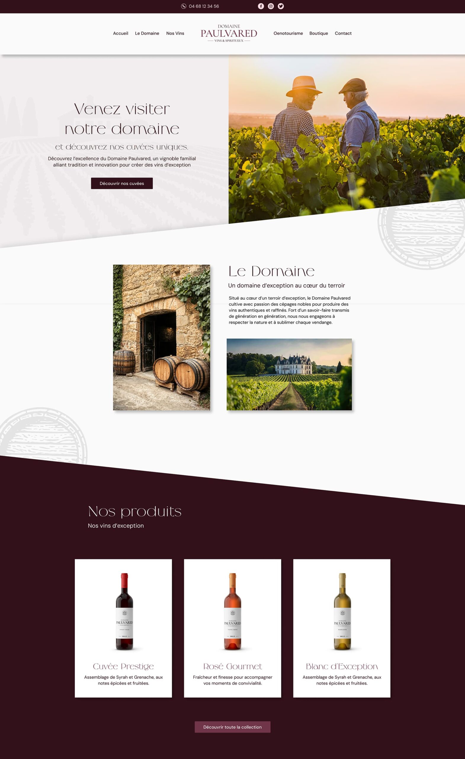 Dans un souci de cohérence graphique, j’ai ensuite décliné ces éléments pour concevoir la page d’accueil du site web. Ce travail d’adaptation m’a permis de renforcer l’identité de Paulvared sur le digital, en assurant une continuité entre les supports imprimés et numériques.